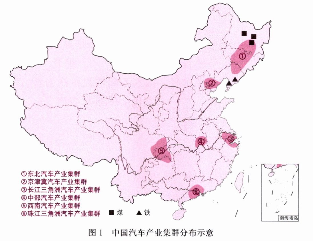 (1) 图中①位于东北三省,即____、____、____(填简称)三个省;据图分析,东北汽车产业集群发展的有利条件是____。
