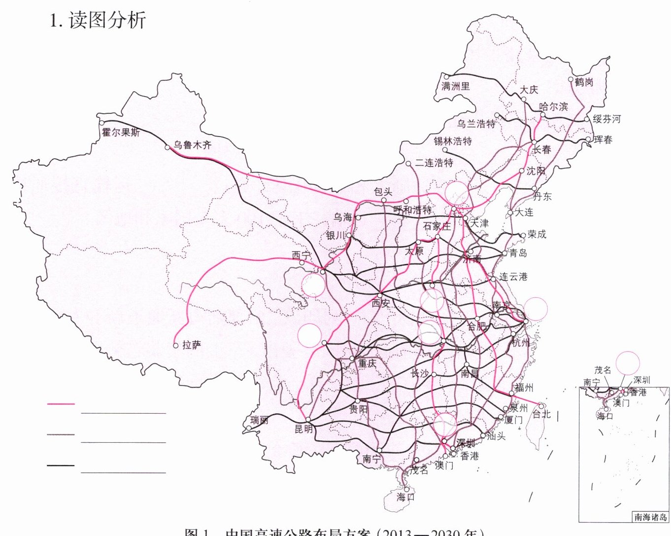 (1)在图1图例的位置填写:首都放射线、南北纵向线和东西横向线。
