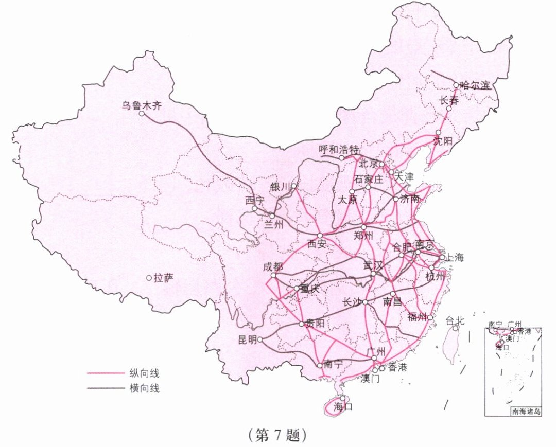 7. 截至2024年底,我国铁路营业里程规模达到16.2万千米,其中高速铁路营业里程4.8万千米。读“中国主要高铁线路的分布”图,回答下列各题。