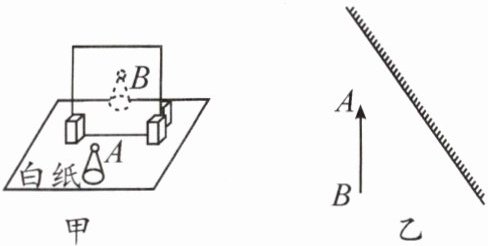 (2)把玻璃板向跳棋方向倾斜,沿水平方向观察,发现桌面上的像不见了;当沿着与玻璃板______的方向观察,又看到了跳棋的像。请在图乙中画出跳棋(AB)在平面镜中所成的像(A'B')。
