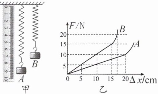5.如图甲所示,学校科技兴趣小组的同学们准备自己动手制作弹簧测力计,他们首先选了A、B两个规格不同、长度相同的弹簧进行测试;并根据测试所得的拉力F和弹簧伸长量Δx的数据绘出如图乙所示的图像。若在这两根弹簧里选一根制作成一个量程较大的弹簧测力计,应选用弹簧