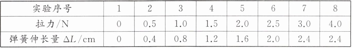 |弹簧伸长量ΔL/cm|0|0.4|0.8|1.2|1.6|2.0|2.4|2.4|