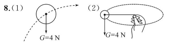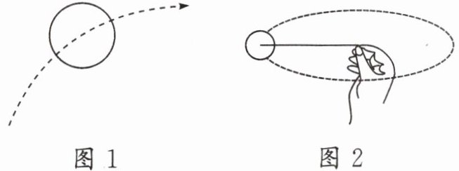 (2)手拉质量为 0.4 kg 的小球在光滑水平桌面上做圆周运动,请在图 2 中画出小球所受重力的示意图。