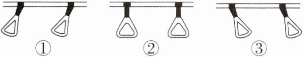 8.右下图所示是小玉乘坐公交车时看到车从某一站点向右直线行驶,经历启动、匀速行驶、减速进站到静止的过程中,拉手所处的不同状态。在这一过程中,下列说法错误的是(