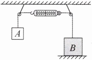 8.如图所示,轻质细绳将物体 A、B 通过两个定滑轮分别连在同一弹簧测力计的两端,其中$ G_A= 10\ N $,$ G_B= 100\ N $,B 是边长为 20 cm 的正方体,整个装置处于静止状态(不计弹簧测力计的重力及滑轮与绳子的摩擦),下列说法正确的是(