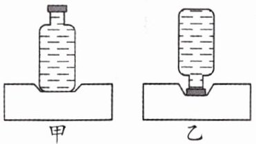 11.为研究“影响压力作用效果的因素”,小科在家中用质量可忽略的塑料瓶和海绵进行实验:测得瓶底面积为$ 40\ cm^2 $,瓶盖面积为$ 8\ cm^2 $,并将瓶子装满 550 mL 水,依次正放和倒放于海绵上(如图)。