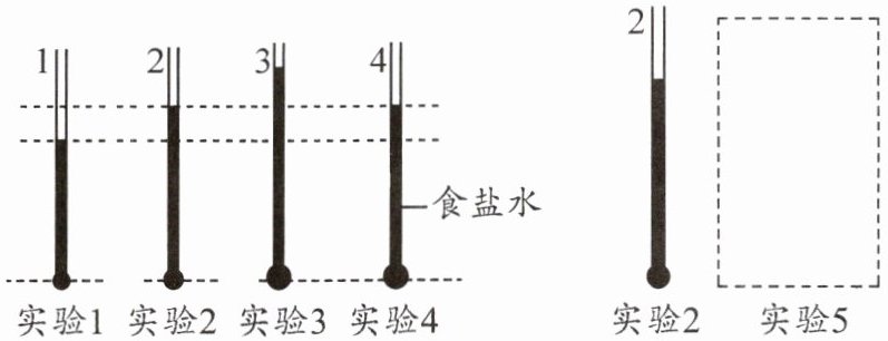 (3)比较图中1、2、3三支玻璃管,小明认为液体内部压强与深度有关,小强认为液体内部压强也可能与液体的质量、重力、体积等有关。为了反驳小强的观点,小明设计了一个实验5与实验2进行比较。请画出实验5玻璃管的形状,并标出液体名称及深度。