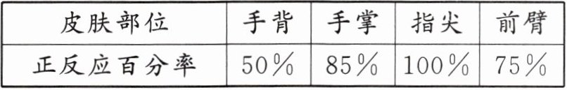 |指尖|前臂||正反应百分率|50%|85%|100%|75%|