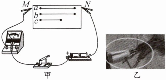5.图甲所示是"探究导体的电阻跟哪些因素有关"的实验装置,a为锰铜合金丝,b、c为镍铬合金丝,其中a、b长度相同,a、b、c粗细相同。实验时通过观察