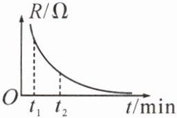 7.某种金属温度升高时,电阻变大。右图为该金属的电阻随时间变化的图像,则$t_2$时刻的温度比$t_1$时刻的温度