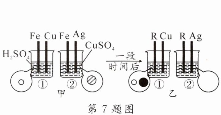 7.为了探究Fe、Cu、Ag、R(R为未知金属)四种金属的金属活动性顺序,进行如下实验:如图甲所示,将四根金属丝同时插入烧杯中的溶液里,只观察到①中铁丝表面出现气泡,②中铁丝表面有紫红色物质;如图乙所示,一段时间后,将烧杯中铁丝替换为R丝进行实验,观察到①中R丝表面出现气泡,②中R丝表面无明显现象。其中:“○”“⊗”“●”为相应金属丝插入烧杯前,烧杯中溶液里存在的阳离子。
