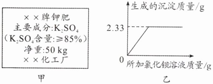 (3) 某同学取 $× ×$ 牌钾肥(如图甲所示)样品 $2.0\ g$,溶于足量的水中,滴加过量氯化钡溶液,产生的沉淀质量与所加氯化钡溶液质量的关系如图乙所示。试通过计算判断该钾肥中硫酸钾的质量分数是否符合产品外包装说明。(杂质不参加反应)