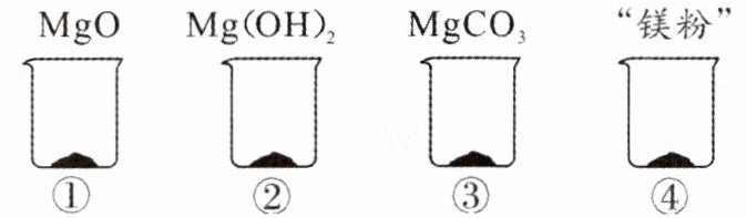 运动员在举重前常常会抓一把“镁粉”在手里搓,以起到防滑效果,某种“镁粉”中只含有 MgO、Mg(OH)₂、MgCO₃中的一种或几种固体。某兴趣小组对其成分展开了探究:分别取 4.2 g MgO、Mg(OH)₂、MgCO₃和“镁粉”置于烧杯中(如图),逐滴加入相同溶质质量分数的稀盐酸直至粉末恰好消失。四种固体消耗的稀盐酸的质量如表所示,且烧杯③和烧杯④中产生了大量气泡。请结合实验现象和数据回答问题。