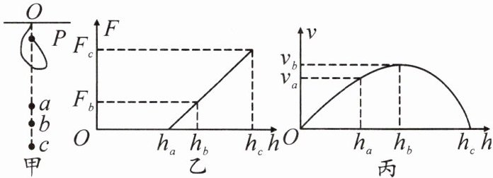 6.小华在金老师的指导下用小球和弹性很好的轻质橡皮筋等器材进行了如下实验(不考虑空气阻力)。让系于橡皮筋一端的小球,从O点正下方的P点由静止释放,分别经过a、b、c三点,如图甲所示。整个下落过程中,橡皮筋所受弹力F与小球下落高度h的关系如图乙所示,小球的速度v与下落高度h的关系如图丙所示。