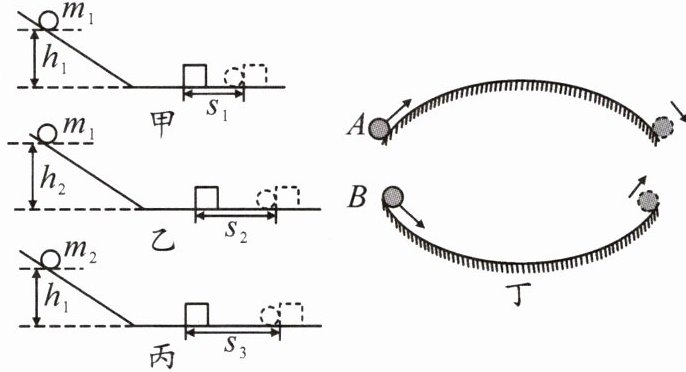 。(3)小金又利用图丁来研究动能和势能的相互转化,图中两个相同的光滑弧形槽,一个为凸形,一个为凹形,A、B两个相同的钢球分别进入两弧形槽的速度都为v,运动到槽的末端速度也都为v,A钢球通过凸形槽的时间为t₁,B钢球通过凹形槽的时间为t₂,则t₁