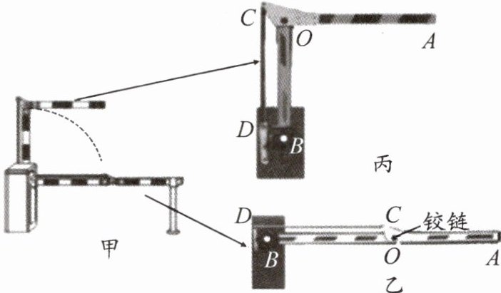 8.某车库出口处的“两段式道闸”开启过程如图甲所示。AO和OB是两段栏杆,长均为2m、质量均为5kg(质量分布均匀),两段栏杆之间以轻质铰链连接,使AO能绕O转动。CD为轻质连杆,B是电机带动栏杆转动的中心点,如图乙所示。当道闸开启时,电机带动水平的AOB和CD转动,道闸完全开启后,AO水平,OB竖直,CD竖直,如图丙所示。此时CD与OB之间距离为5cm。(不计一切摩擦,g取10N/kg)