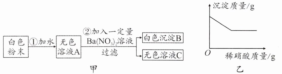 (1)取白色沉淀 B 于烧杯中并逐滴加入稀硝酸,烧杯中沉淀的质量与滴加的稀硝酸的质量的关系如图乙所示,可确定原白色粉末中一定含有