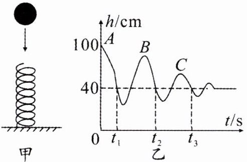 5. 如图甲所示,将小球从弹簧正上方的某处静止释放,它的高度随时间变化的情况如图乙所示。小球最终静止在弹簧上时,弹簧长为 40 厘米。比较 A、B、C 三点可知小球在运动过程中机械能
