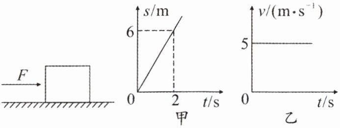 5. 如图所示,物体在同一水平面上做匀速直线运动。当物体运动的路程与时间的关系图像如图甲所示时,受到的水平推力为 $ F_{1} $;当物体运动的速度与时间的关系图像如图乙所示时,受到的水平推力为 $ F_{2} $。两次推力的功率分别为 $ P_{1} $、$ P_{2} $。则 $ F_{1} : F_{2} $ 和 $ P_{1} : P_{2} $ 分别为(