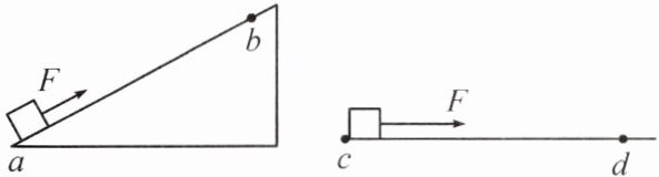 2. 如图,用大小相等的拉力 $ F $ 分别沿斜面和水平面拉木箱,拉力方向和运动方向始终一致。运动时间 $ t_{ab} > t_{cd} $,运动距离 $ s_{ab} = s_{cd} $,比较两种情况下拉力所做的功和功率(