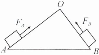 4. 如图所示,在相等的时间内把同一物体分别沿 $ AO $、$ BO $ 两个光滑斜面从底端匀速拉到相同的高度,拉力所做的功分别为 $ W_{A} $ 和 $ W_{B} $,功率分别为 $ P_{A} $ 和 $ P_{B} $,它们之间的关系是()