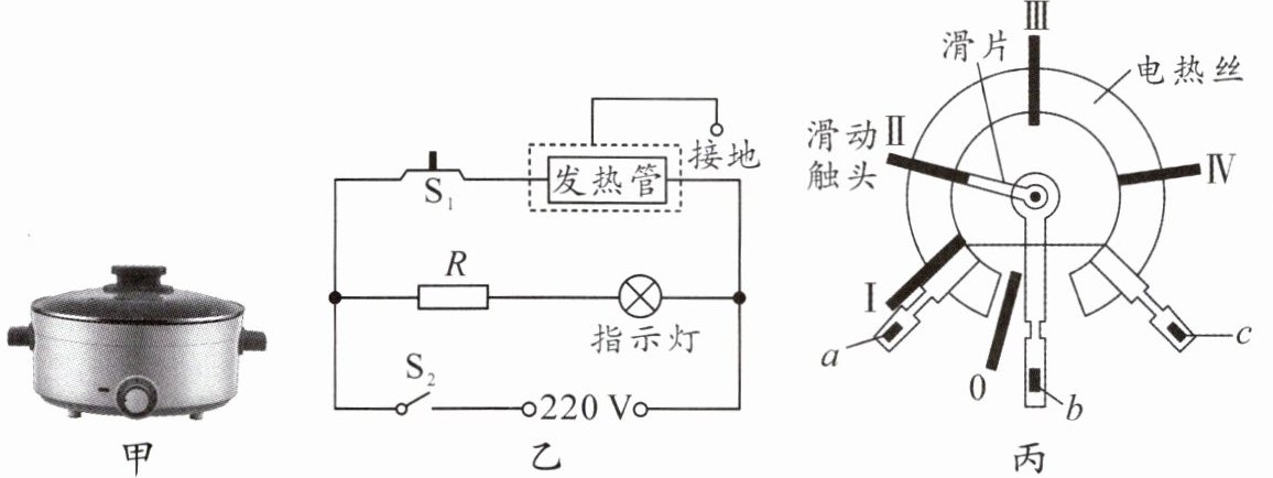 8.图甲是某款电火锅,其内部简化电路如图乙所示,S₁是旋钮开关,S₂是温控开关(当锅体温度达到设定值时自动断开,当锅体温度低于一定值时自动闭合),R是指示灯的分压电阻,不起到加热作用。发热管内部结构如图丙所示,滑片转动时只能与滑动触头接触,0挡为断开状态,Ⅰ、Ⅱ、Ⅲ、Ⅳ挡的功率各不相同,电热丝被均分为四段接入电路,其他元件的电阻均忽略不计。