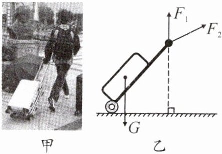 10. 美好的一天,从拉着行李箱返校学习开始。图甲中的同学拉着行李箱健步行走在校园水平路面上,行李箱匀速前进并保持倾角不变。假如这一过程中行李箱(含箱内物体)受到的重力$G$如图乙所示,则该同学对行李箱施加的拉力有没有可能是图乙中的$F_{1}$、$F_{2}$? 下列判断正确的是(