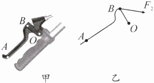 7. 图甲是自行车的手闸,其中$ABO$部分可视为一种杠杆,图乙是其简化示意图,$O$为支点,$F_{2}$为阻力,请在图乙中画出: