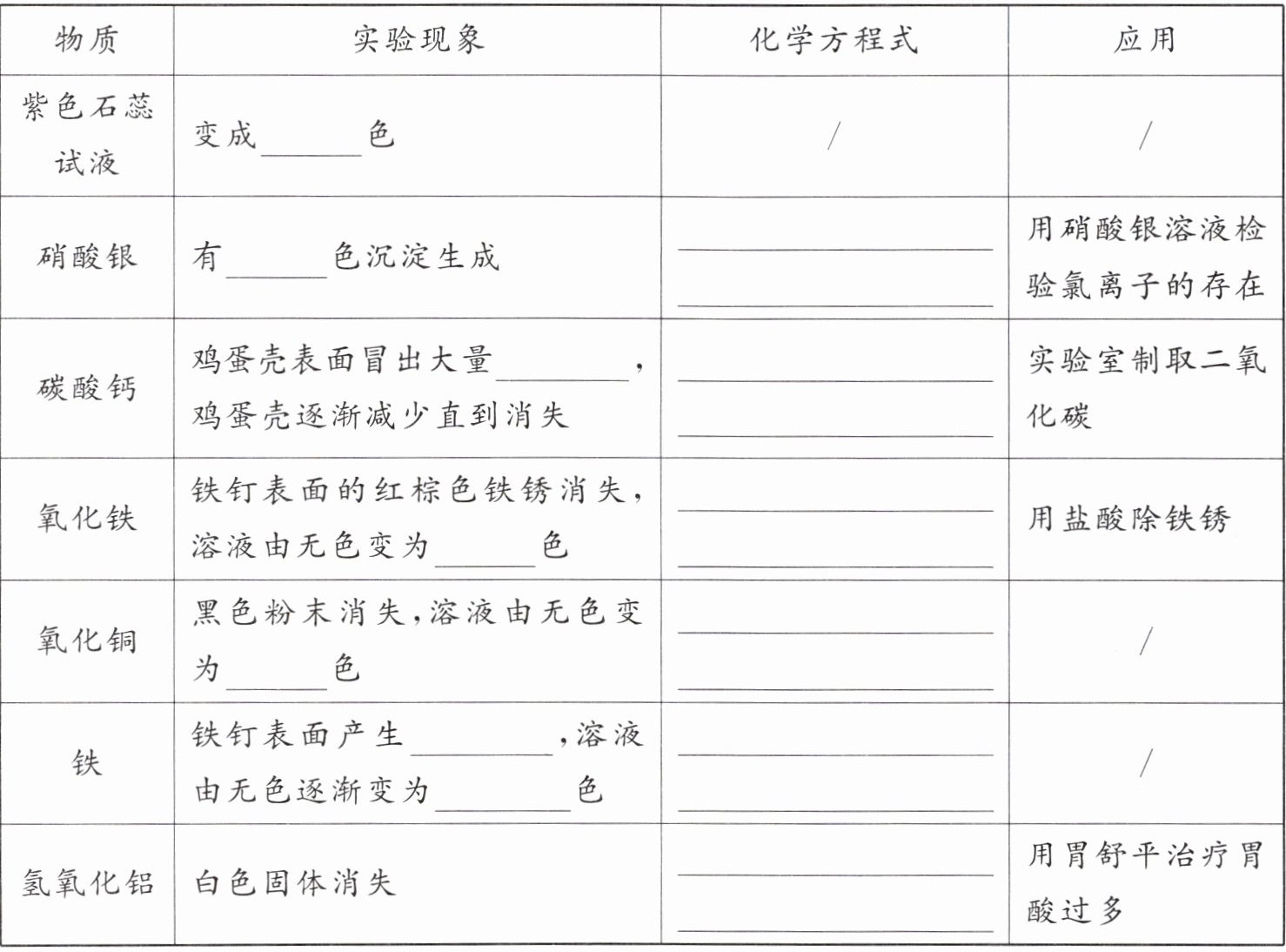 二、1.红 白 $HCl + AgNO_3 \longrightarrow AgCl \downarrow + HNO_3$ 气泡 $2HCl + CaCO_3 \longrightarrow CaCl_2 + CO_2 \uparrow + H_2O$ 黄 $6HCl + Fe_2O_3 \longrightarrow 2FeCl_3 + 3H_2O$ 蓝 $2HCl + CuO \longrightarrow CuCl_2 + H_2O$ 气泡 浅绿 $2HCl + Fe \longrightarrow FeCl_2 + H_2 \uparrow$ $3HCl + Al(OH)_3 \longrightarrow AlCl_3 + 3H_2O$