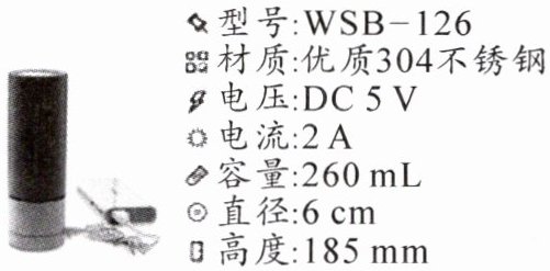 6. 便携温水杯不仅方便携带,还可以支持充电宝、电脑等的 USB 直流加热,使出门在外的人们更加方便。右图所示为某品牌便携温水杯及相关参数信息,该品牌的电池容量为 12800 mAh。[水的比热容为 4.2×10³ J/(kg·℃),水的密度为 1×10³ kg/m³]