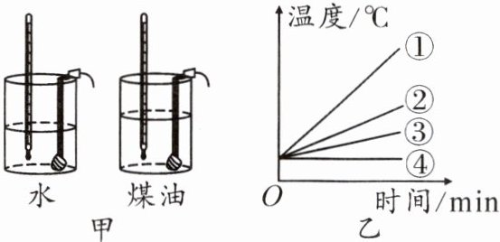 (2) 用两个相同规格的电加热器来加热水和煤油,每隔 1 min 记录一次温度,整个实验操作无误。图乙中,若图线②反映水的温度随时间的变化规律,则图线