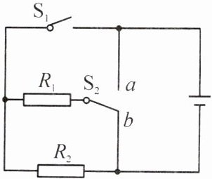 8. 小明家买了一台电烤箱,发热功率有高温、中温、低温三挡。小明根据电烤箱的工作情况,跟同学们在实验室组成模拟电烤箱的实验电路(如图所示)。电源输出电压稳定为 $ 6 \, V $,两个发热电阻分别为 $ R_{1} = 10 \, \Omega $,$ R_{2} = 20 \, \Omega $。单刀双掷开关 $ S_{2} $ 可分别与触点 $ a $、$ b $ 接通。请你参与小明与同学们的研究,分析和解答以下问题。