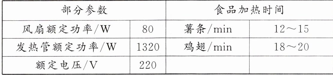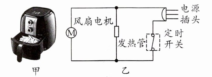 7. 空气炸锅是一种新型家电,图甲所示是某型号空气炸锅,其内部电路如图乙所示,部分参数和食品加热时间如表所示。其工作原理是通过发热管迅速加热锅内空气,利用大功率风扇形成循环的热流,使盛放篮内的食品均匀受热,不放油也能达到类似煎炸的效果。