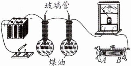 探究“电流通过导体产生热的多少跟哪些因素有关”的实验电路如图所示(烧瓶、煤油质量和玻璃管均相同)。烧瓶中的电阻采用金属丝。
