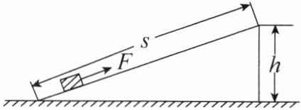 4. 如图所示,斜面长 $ s = 1.5 \, m $,高 $ h = 0.3 \, m $。建筑工人将重 $ G = 500 \, N $ 的货物箱用绳子从斜面底端匀速拉到顶端时,沿斜面向上的拉力 $ F = 150 \, N $,忽略绳子重力。则该过程中拉力 $ F $ 做的功是