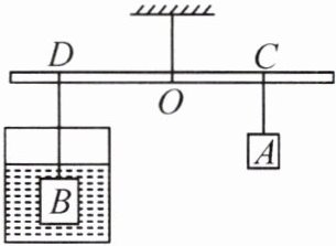 3. 如图所示,用细线将一质量可忽略不计的杠杆悬挂起来。把质量为 $ 0.3 \, kg $ 的物体 $ A $ 用细线悬挂在杠杆的 $ C $ 处,质量为 $ 0.5 \, kg $ 的物体 $ B $(物体 $ B $ 不溶于水)用细线悬挂在杠杆的 $ D $ 处。当物体 $ B $ 浸没于水中静止时,杠杆恰好在水平位置平衡。此时 $ C $、$ D $ 处到 $ O $ 点的距离分别为 $ 20 \, cm $、$ 30 \, cm $。($ g $ 取 $ 10 \, N/kg $)求: