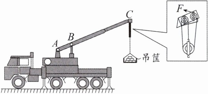 2. 右下面是吊车提升建材的示意图。重 $ 570 \, N $ 的建材在吊绳拉力 $ F $ 的作用下以 $ 0.5 \, m/s $ 的速度向上运动了 $ 10 \, s $。忽略滑轮与吊绳间的摩擦力、起重杆 $ AC $ 自重以及吊绳所受的重力,动滑轮重力为 $ 30 \, N $,吊篮的重力为 $ 600 \, N $。求: