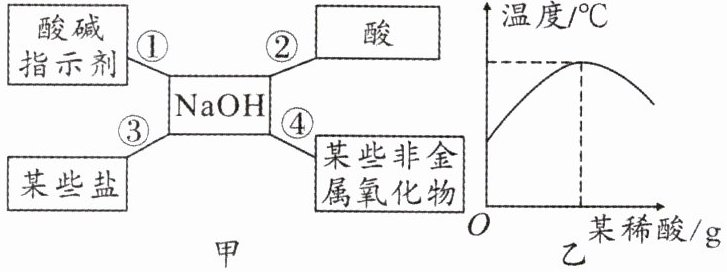 9.归纳总结是学习科学的重要方法,小明同学用思维导图的形式总结了NaOH的四条化学性质,如图甲所示(即NaOH与四类物质能够发生化学反应)。请回答: