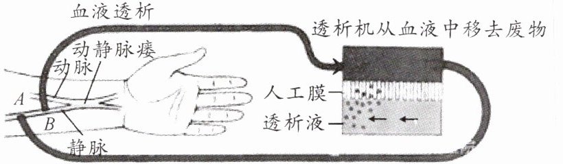 (填“A”或“B”)点回流至人体。(4)与肾单位相比,人工透析机的工作过程不具备