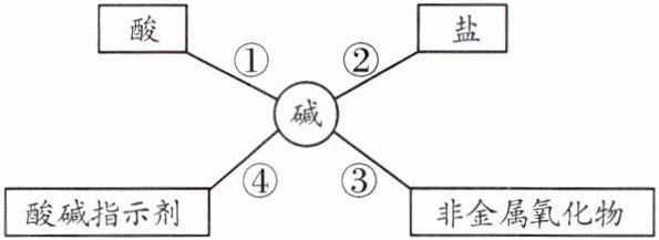 7. 氢氧化钠具有强烈的腐蚀性,使用时必须十分小心,实验时最好戴防护眼镜。为了便于理解和记忆,小丽同学总结了碱的化学性质,如下图所示,请你根据要求回答下列问题。