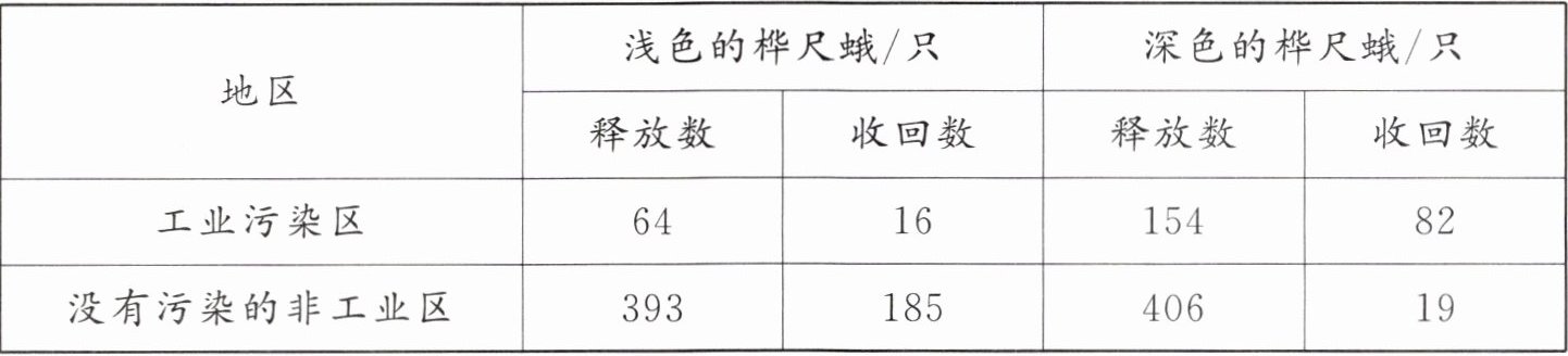 6. 科研小组做了如下实验:先将深色的桦尺蛾和浅色的桦尺蛾分别做标记,然后放养于工业污染区和没有污染的非工业区。经过一段时间后将所放养的桦尺蛾尽量收回,计算其数目,结果如表所示。