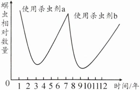 的结果。当第 7 年使用杀虫剂 b 时,螟虫由于不适应改变了的环境而大量死亡,经过再次积累,新的个体重新适应
