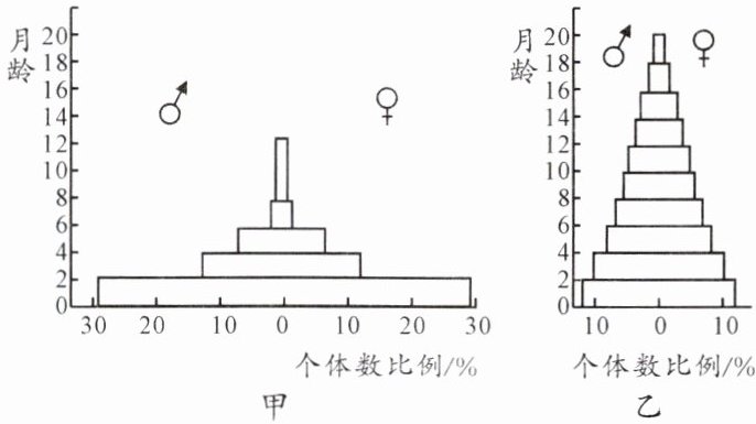 4. 调查甲、乙两草原所捕获的田鼠,它们的月龄构成分别如图所示。