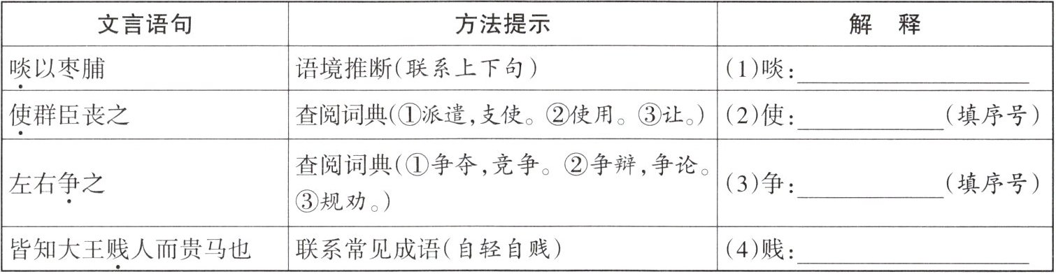 |使群臣丧之|查阅词典(①派遣,支使。②使用。③让,叫。)|(2)使:______(填序号)|