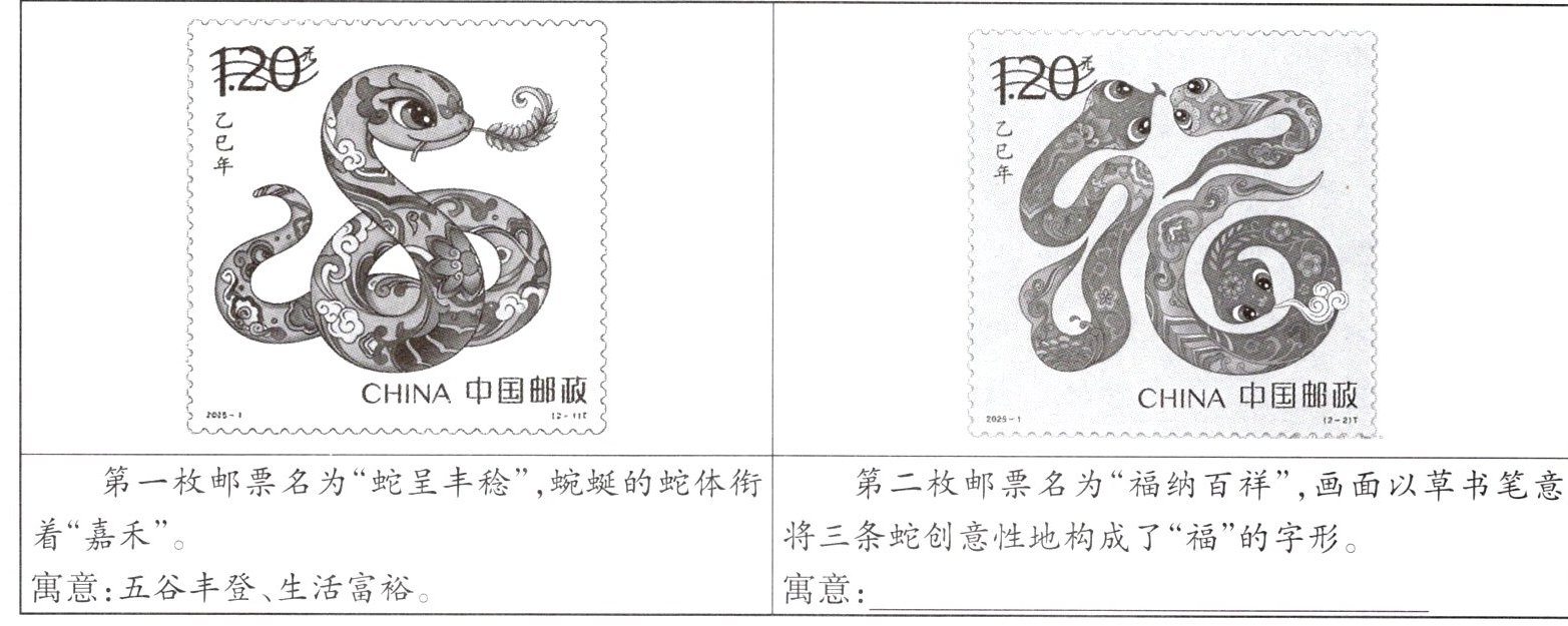 6. 2025年是中国蛇年,班刊特设了专栏“蛇年说蛇”。下面是2025年我国发布的两枚蛇年生肖邮票,请你参照第一枚邮票的寓意,写出第二枚邮票的寓意。(2分)