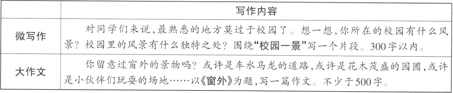 | 微写作 | 对同学们来说,最熟悉的地方莫过于校园了。想一想,你所在的校园有什么风景?校园里的风景有什么独特之处?围绕“校园一景”写一个片段。300字以内。 |