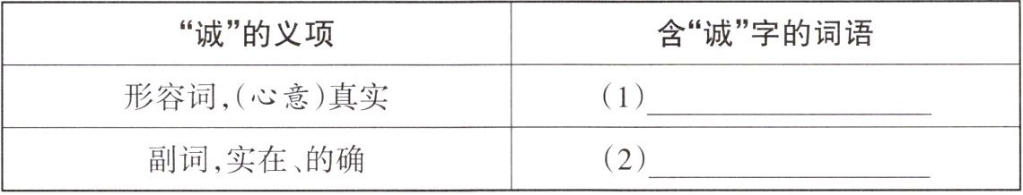 1. 下面是小雯整理的关于“诚”字的资料卡片,请你在(1)(2)处分别补充一个含“诚”字的词语。(2分)