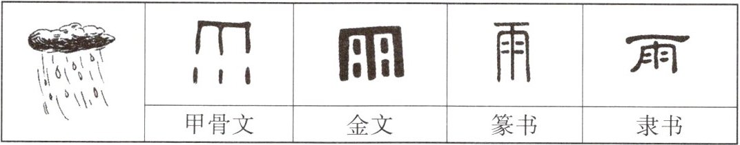 2. 为了让大家更好地了解“雨”的本义,班长在PPT第二页放入“雨”字的字形演变的图片,据此推断“雨”字的基本含义是 。(2分)