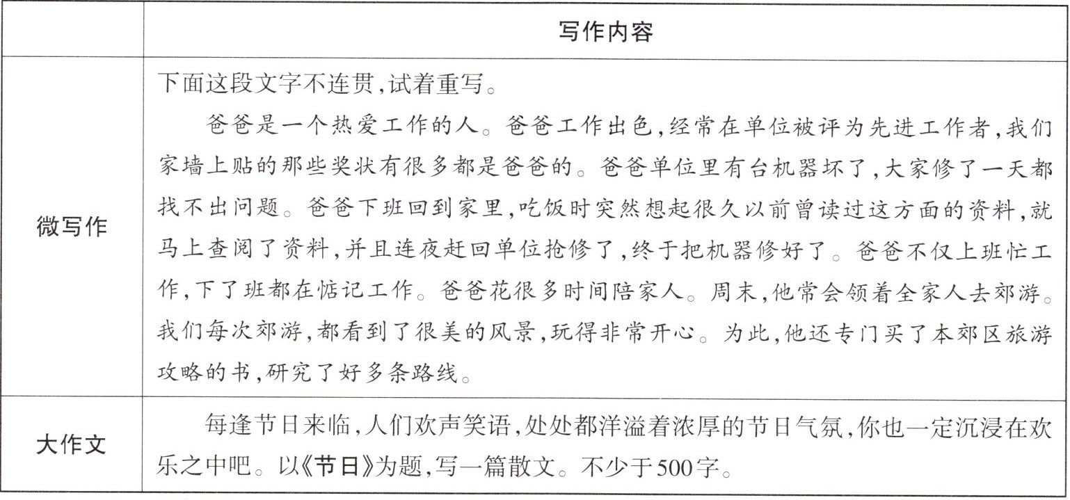 | 大作文 | 每逢节日来临,人们欢声笑语,处处都洋溢着浓厚的节日气氛,你也一定沉浸在欢乐之中吧。以《节日》为题,写一篇散文。不少于500字。 |