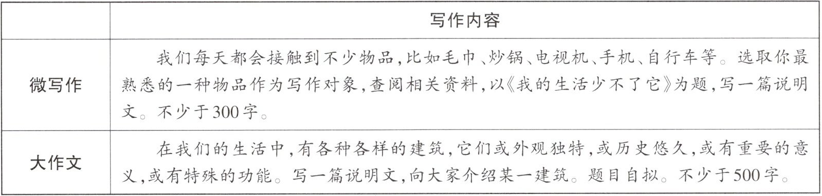 | 微写作 | 我们每天都会接触到不少物品,比如毛巾、炒锅、电视机、手机、自行车等。选取你最熟悉的一种物品作为写作对象,查阅相关资料,以《我的生活少不了它》为题,写一篇说明文。不少于300字。 |